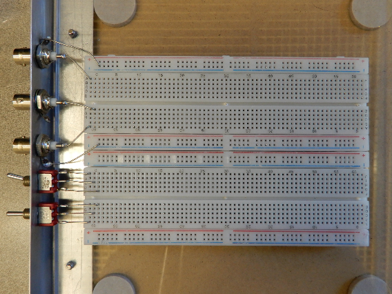 To the left are three BNC jacks for connecting coaxial cables to the waveform generator and oscilloscope. The two three-way SPDT switches can be used to control your circuit behaviour.