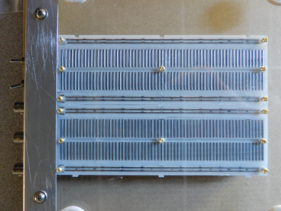 Your workstation has two solderless breadboards, arraged side-by-side. They are not electrically connected. Further information on the solderless breadboard and breadboarding techniques can be found here.