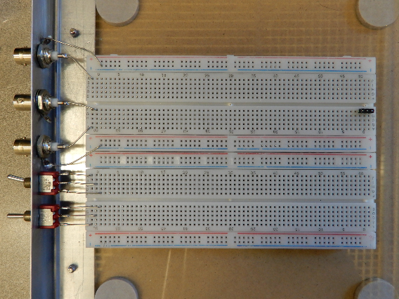 Later, you can use jumpers to bring power to the power rows on the lower breadboard, as necessary.