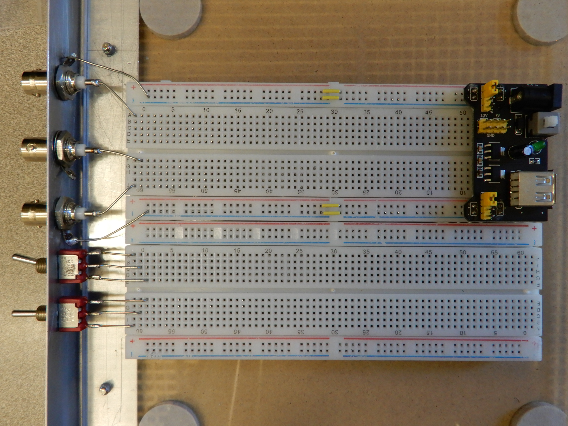 The USB module can supply 1A of direct current at 5V to the breadboard. The red (+) rows of holes have a potential difference of V+=+5V, relative to the blue (-) rows of holes, the ground reference (GND) at V-=0V. Avoid 'shorting' these nodes; this may damage the module asd/or breadboard. More info on the power module can be found here.