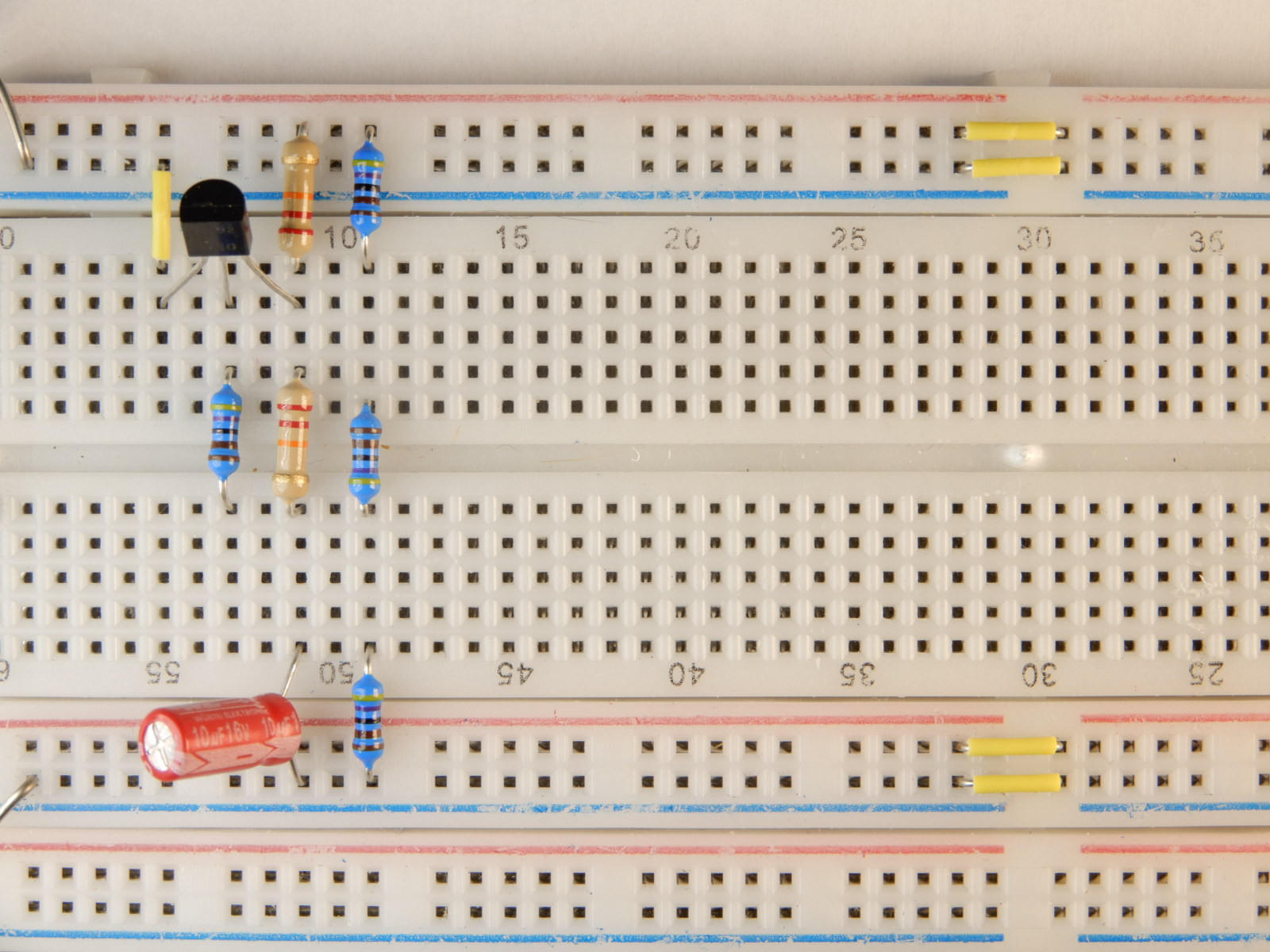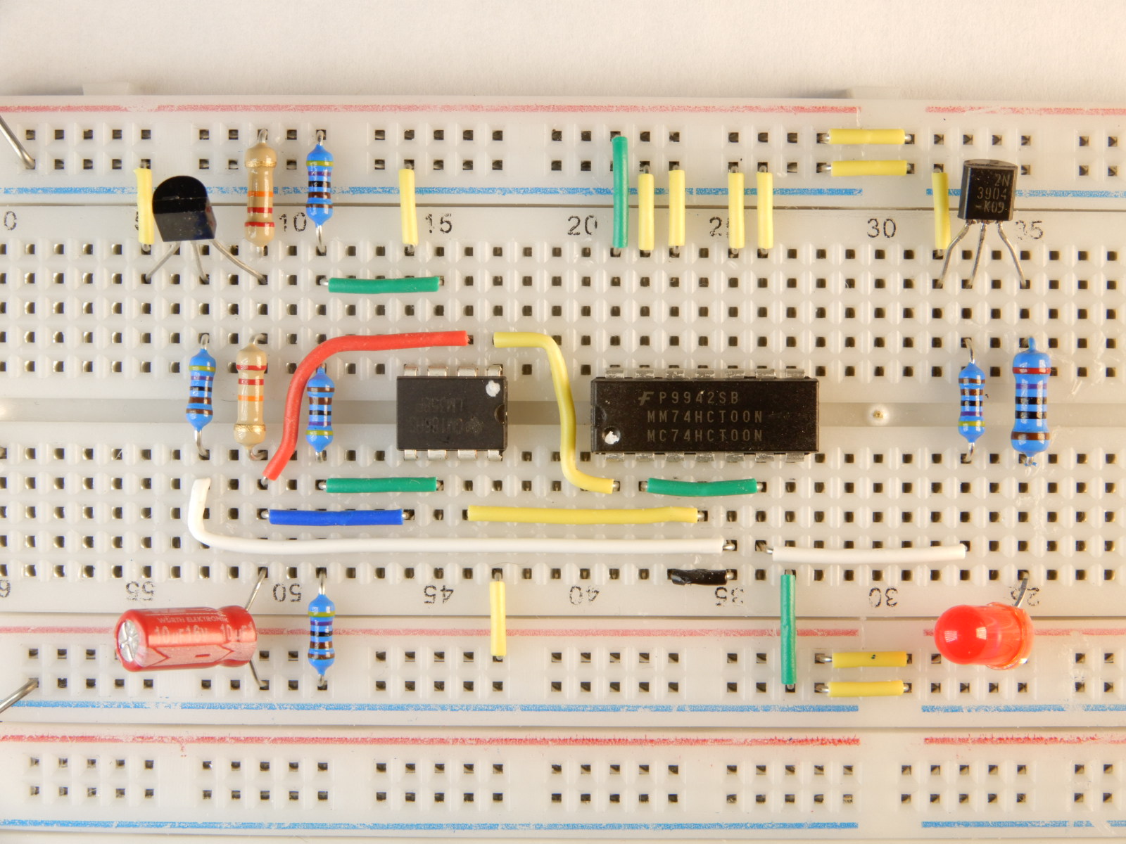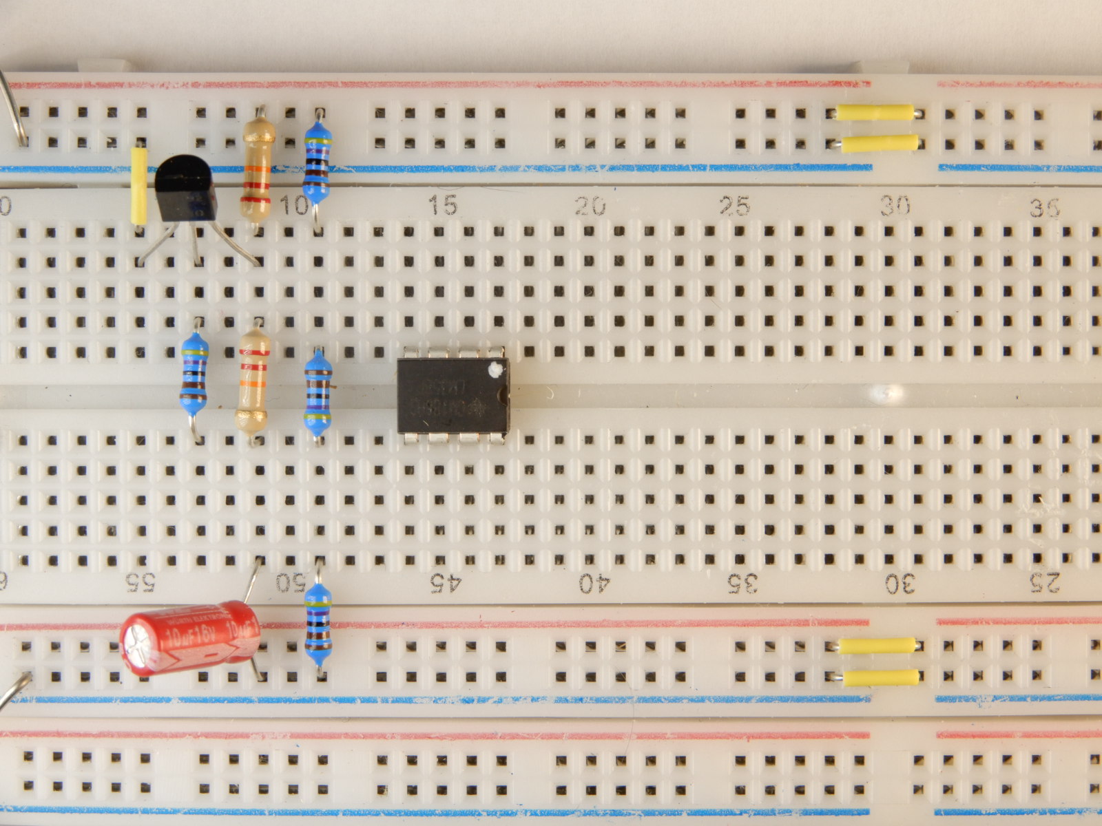 Carefully review your breadboard circuit and verify that every connection and part placement matches the layout of the accompanying picture.