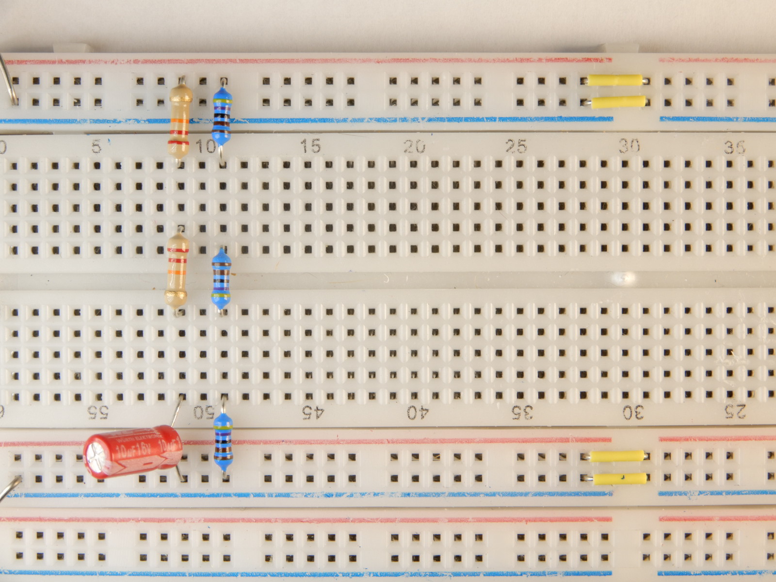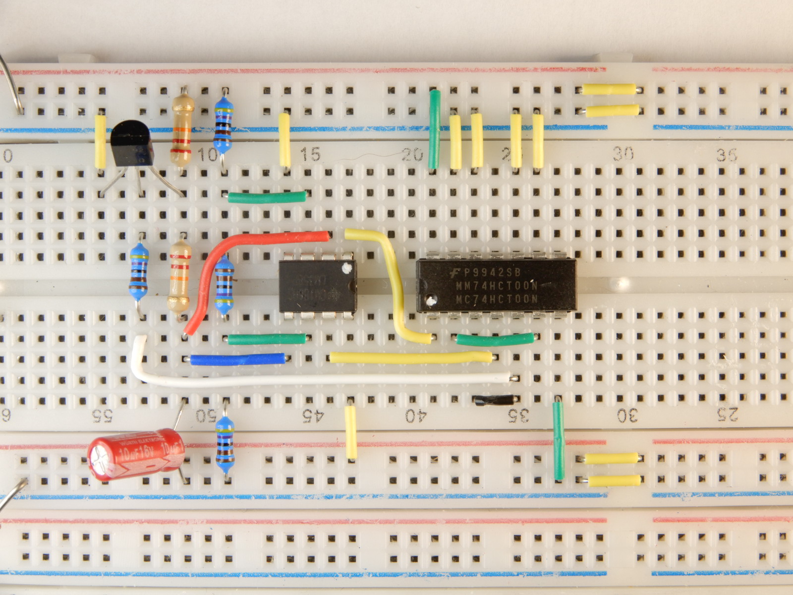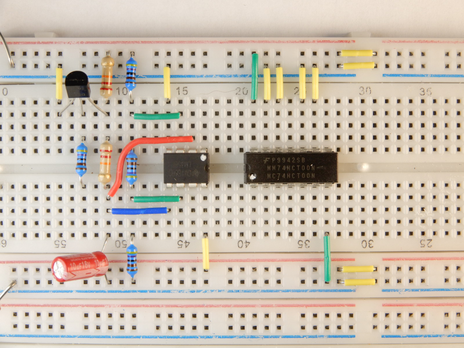 Carefully review your breadboard circuit and verify that every connection and part placement matches the layout of the accompanying picture.