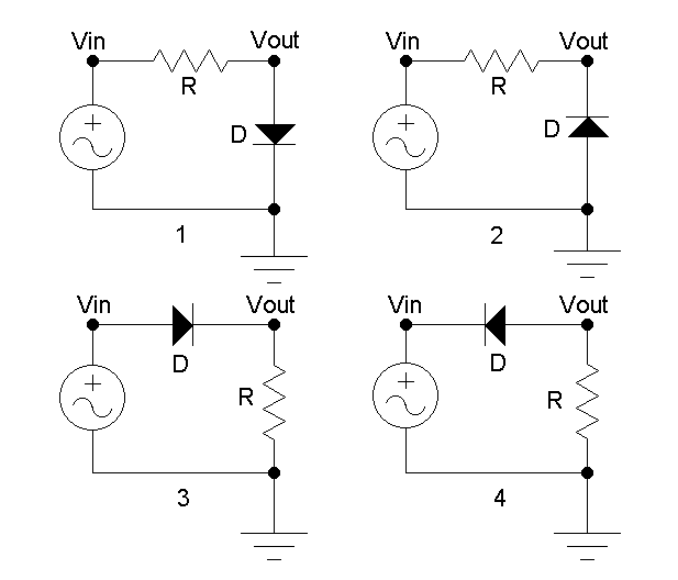 To observe the circuit behaviour, remove any components used in the previous lab. For each of the four diode configurations: