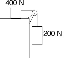 In the drawing, the weight of the block on the table is 400 N and that of the hanging block is 200 N. Ignoring all frictional effects and assuming the pulley to be massless, find (a) the acceleration of the two blocks and (b) the tension in the cord.
