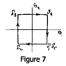 It can't swim because it only has one hinge, and if you have only one degree of freedom in configuration space, you are bound to make a reciprocal motion. There is nothing else you can do. The simplest animal that can swim that way is an animal two hinges. I don't know whether one exists but Fig. 7 shows a hypothetical one. This animal is like a boat with a rudder at both front and back, and nothing else. This animal can swim. All it has to do is go through the sequence to configurations shown, returning to the original one at S_5. Its configuration space, of course, is two dimensional with coordinates \theta1, \theta2. The animal is going around a loop in that configuration space, and that enables it to swim. In fact, I worked this one out just for fun and you can prove from symmetry that it goes along the direction shown in the figure. As an exercise for the student, what is it that distinguishes that direction?