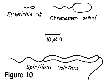 Well, let's look at some real animals (Fig. 10). This figure I've taken from a paper of Howard Berg that he sent me. Here are three real swimmers. The one we're going to be talking about most is the famous animal, Escherichia coli, at A, which is a very tiny thing. Then there are two larger animals. I've copied down their Latin names and the may be old friends to some of you here. This thing (S. volutans) swims by waving its body as well as its tail and roughly speaking, a spiral wave runs down that tail. The bacterium E. coli on the left is about 2 micron long. The tail is the part that we are interested in. That's the flagellum. Some E. coli cells have them coming out the sides; and they may have several, but when they have several they tend to bundle together. Some cells are nonmotile and don't have flagella. They live perfectly well, so swimming is not an absolute necessity for this particular animal, but the one in the figure does swim. The flagellum is only about 130 angstrom in diameter. It is much thinner than the cilium which is another very important kind of propulsive machinery. There is a beautiful article on cilia in the October 1974 issue of Scientific American. Cilia are about 2000 angstrom in diameter, with a rather elaborate apparatus inside. There's not room for such apparatus inside this flagellum.