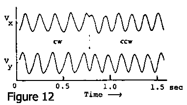 Within the year a very elegant, crucial experiment by Silverman and Simon at UC-San Diego showed that this fact is the case. Their experiment involved a mutant strain of E. coli bacteria which don't make flagella at all but only make something called the proximal hook to which the flagella would have been attached. They found that whit antihook antibodies they could cause these things to glue together. And once in a while one of the bacteria would have its hook glued to the microscope slide, in which case the whole body rotated at constant angular velocity. And when two hooks glued together, the two bodies counter-rotated, as you would expect. It's a beautiful technique. Howard was ready with his tracker and the next picture (Fig. 12) shows his tracker following the end of one of these tethered E. coli cells which is stuck to the microscope slide by antibody at the place where the flagellum should have been. Plotted here are the two velocity components V_x and V_y. The two velocity components are 90 degrees out of phase. The point being tracked is going in a circle. In the middle of the figure, you see a 90 degrees phase change in one component, a reversal of rotation. They can rotate hundreds of revolutions at constant speed and then turn around and rotate the other way. Evidently the animal actually has a rotary joint, and has a motor inside that's able to drive a flagellum in one direction or the other, a most remarkable piece of machinery.