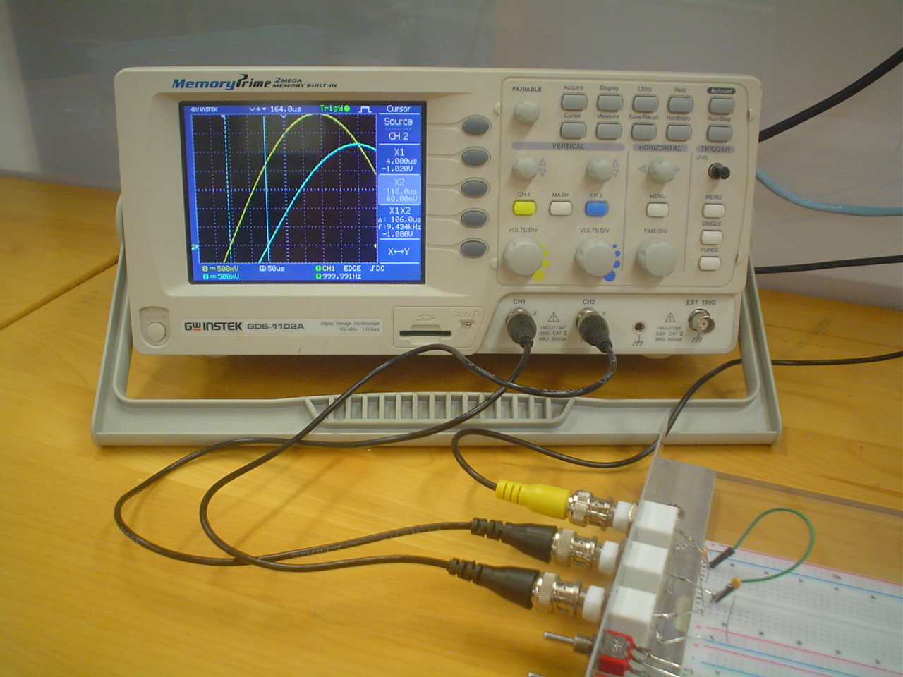 The oscilloscope is connected to the breadboard using BNC (Bayonet Neill-Concelman) coaxial cables. The two black cables are connected to the scope input channels CH1 and CH2. The yellow cable is here connected to an off-screen waveform generator that provides a signal to the breadboard circuitry.