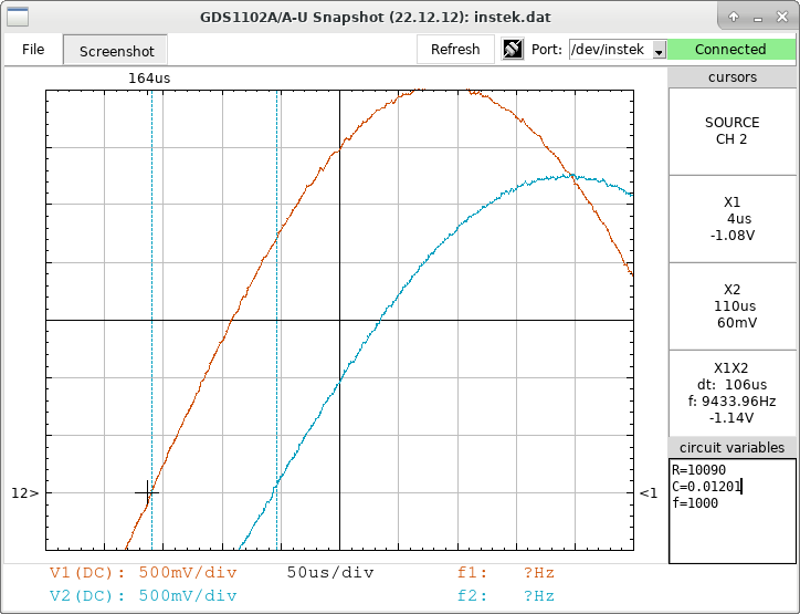 The two vertical framing cursors are here set to measure the time difference between two waveforms aligned to the same voltage level, V1=V2=0, with overlapping markers displayed as 12>.