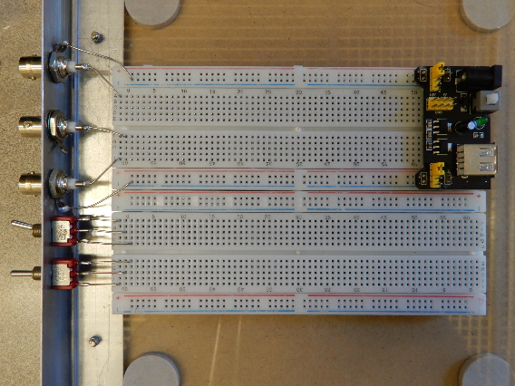 Later, you can use jumpers to bring power to the power rows on the lower breadboard, as necessary.