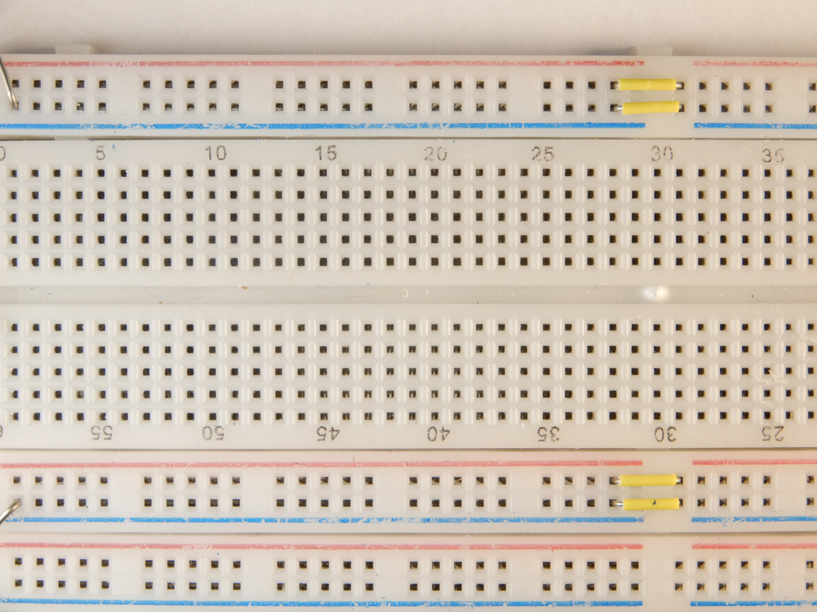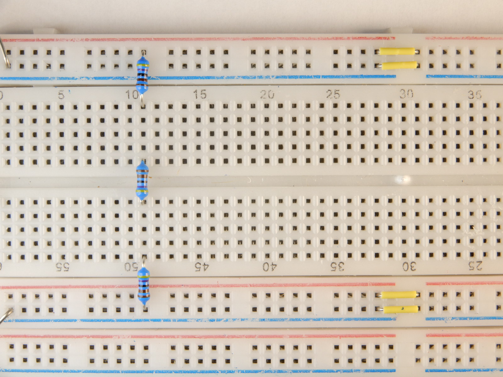 On some breadboards, the power and ground rails are disconnected at the middle of the breadboard. To propagate power the full length of the board, connect the two halves using four yellow jumpers, as shown.