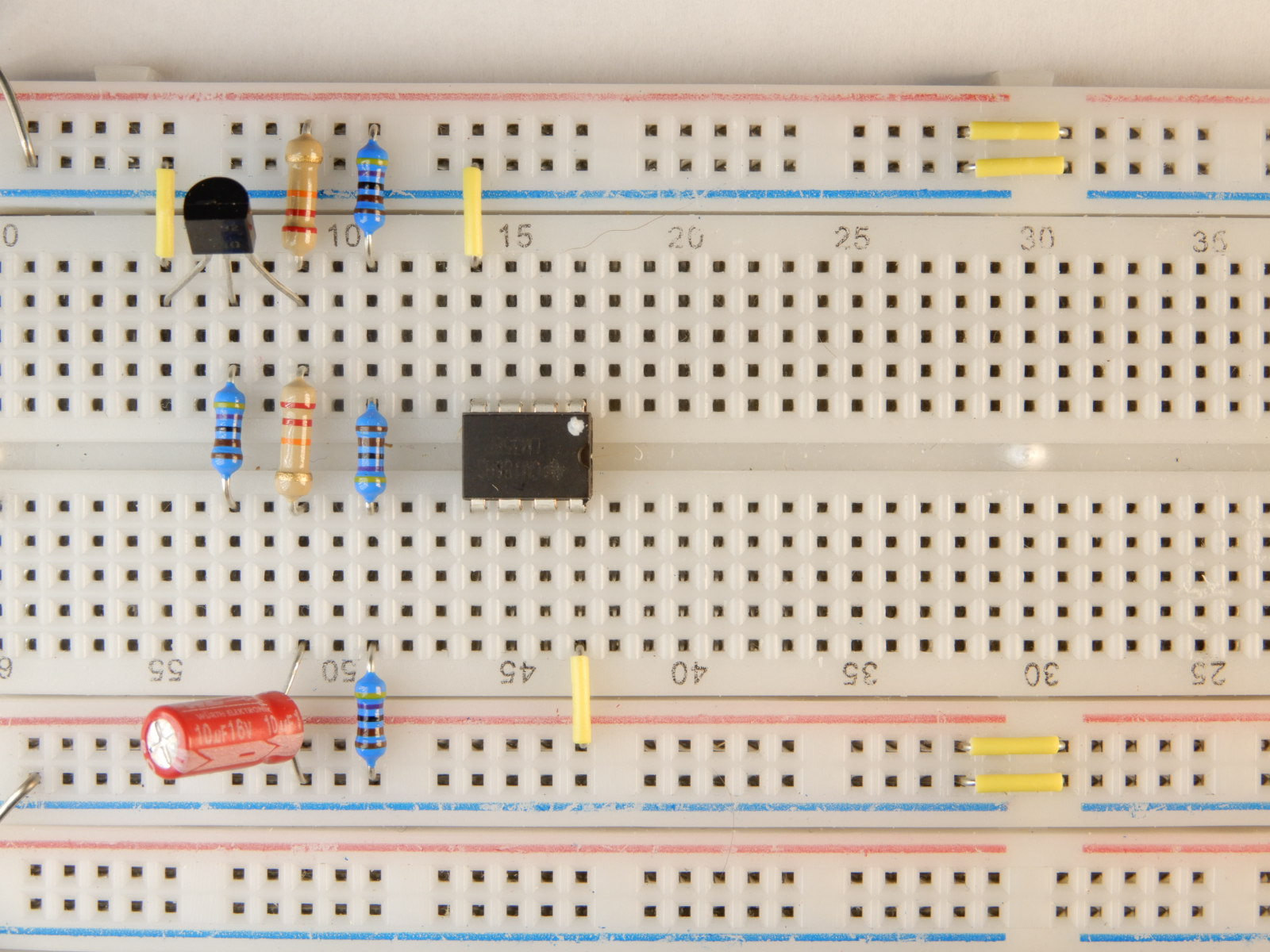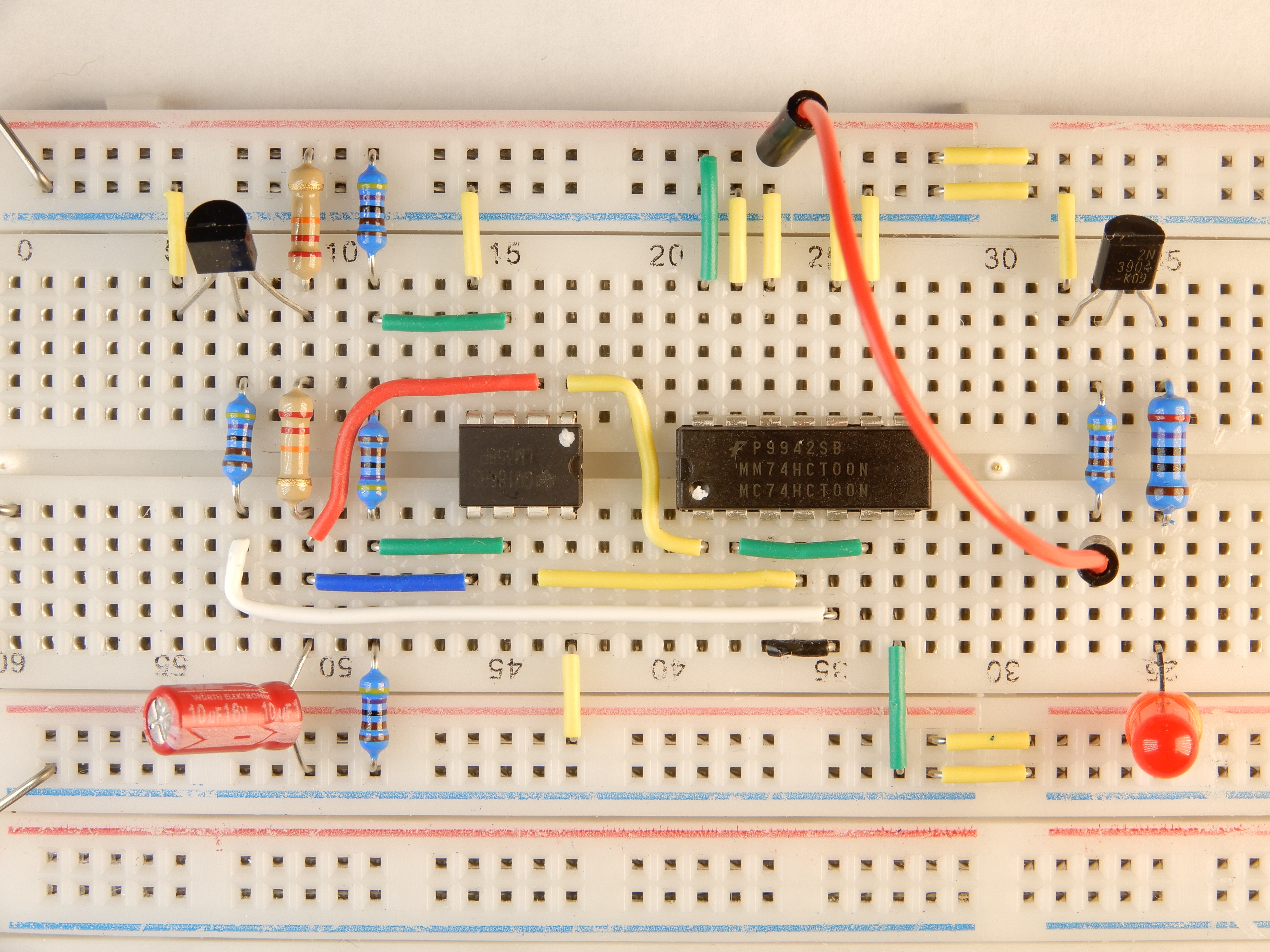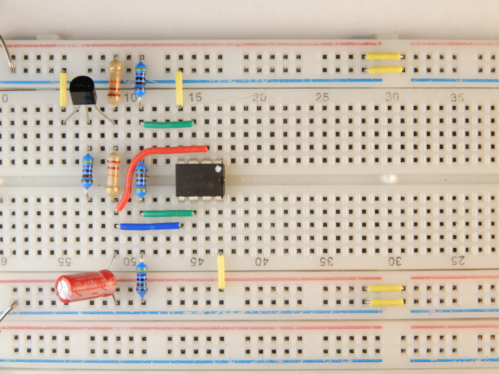 Carefully review your breadboard circuit and verify that every connection and part placement matches the layout of the accompanying picture.