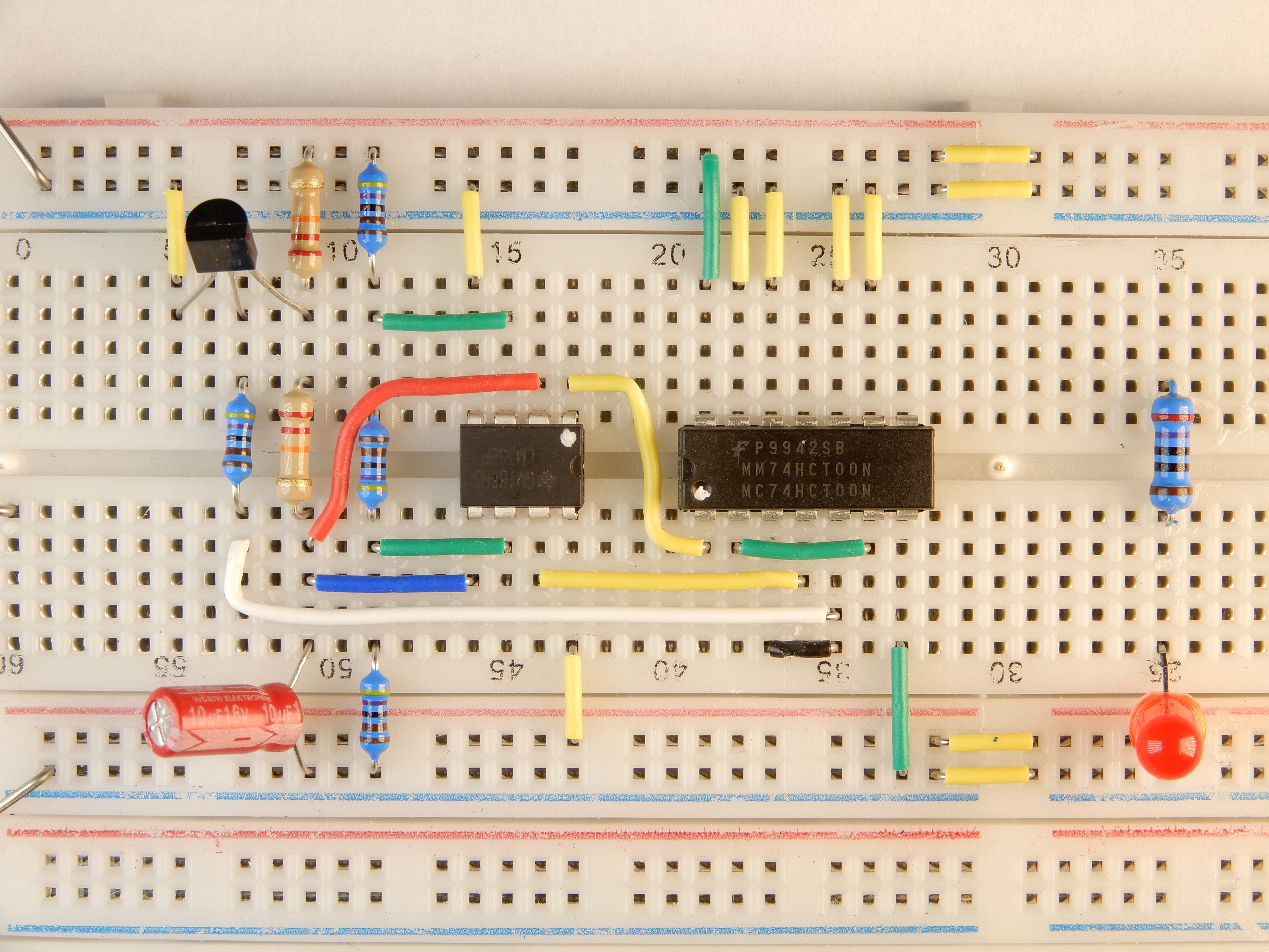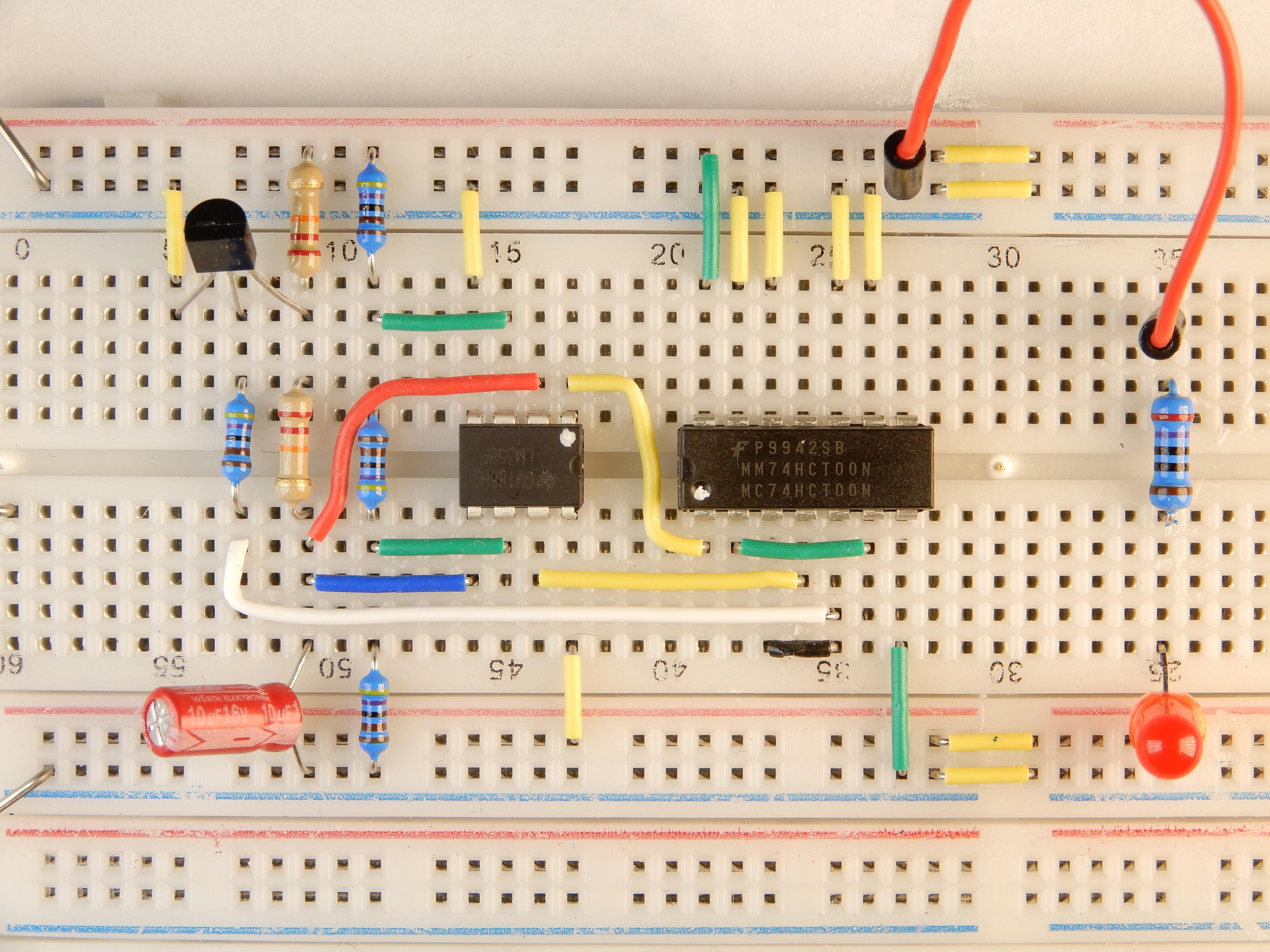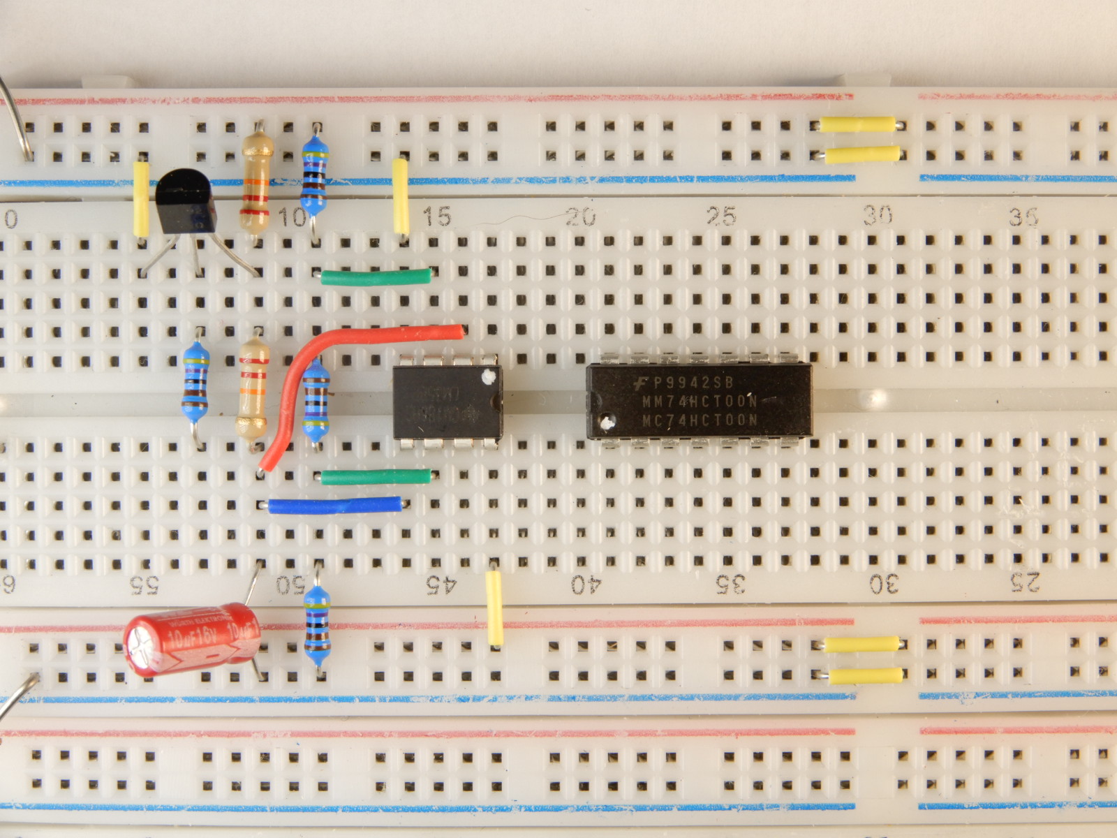 Carefully review your breadboard circuit and verify that every connection and part placement matches the layout of the accompanying picture.