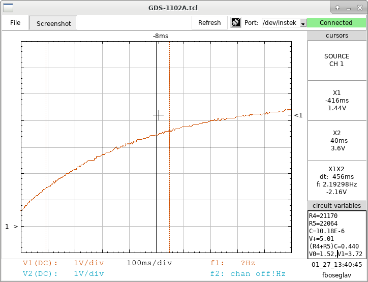 where V∞ is the voltage at the steady-state end of the transient. Displayed is a capacitor discharge curve. To measure τ: