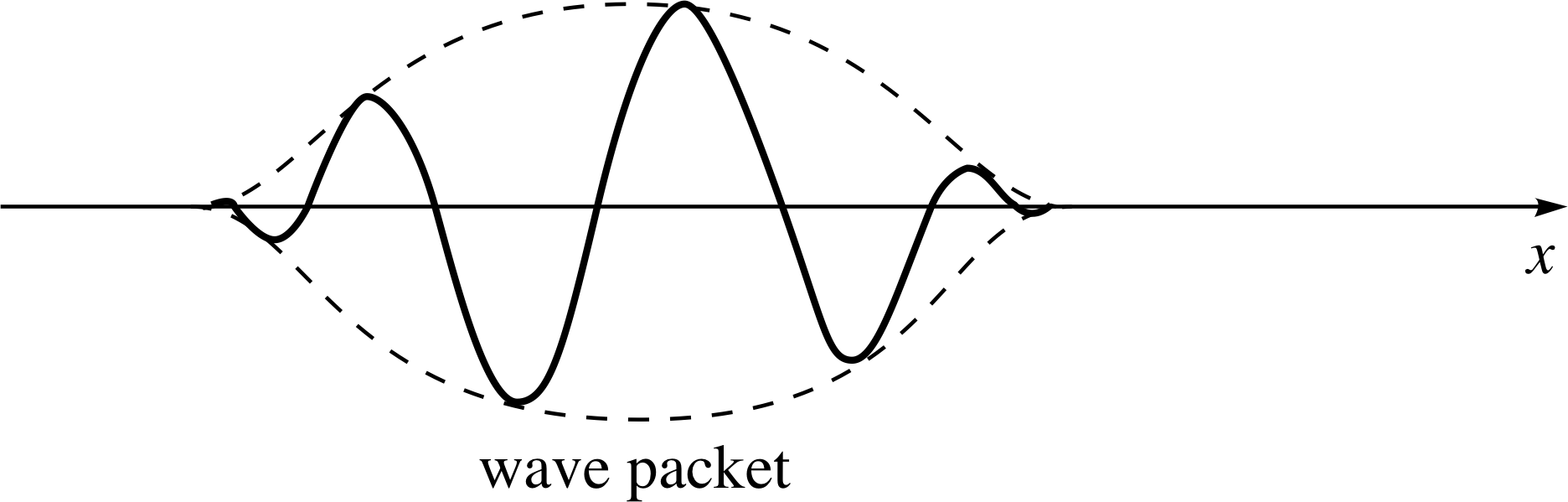 A simple one–dimensional de Broglie wave of fixed amplitude and wavelength, extending to infinity along the x–direction, corresponds to a particle whose momentum magnitude is perfectly known. Unfortunately, such a wave is not localized in space; its amplitude is the same everywhere, and so it conveys no information at all about the position of the particle. If we wish to produce a wave of finite extent, with some implied localization of the particle, then we must construct a wave packet by superposing (adding) waves, and arrange for this superposition to diminish sharply outside the expected range of particle positions ∆x. In discussing this process it is convenient to use as the variable the angular wavenumber k rather than the wavelength λ – the two are related by