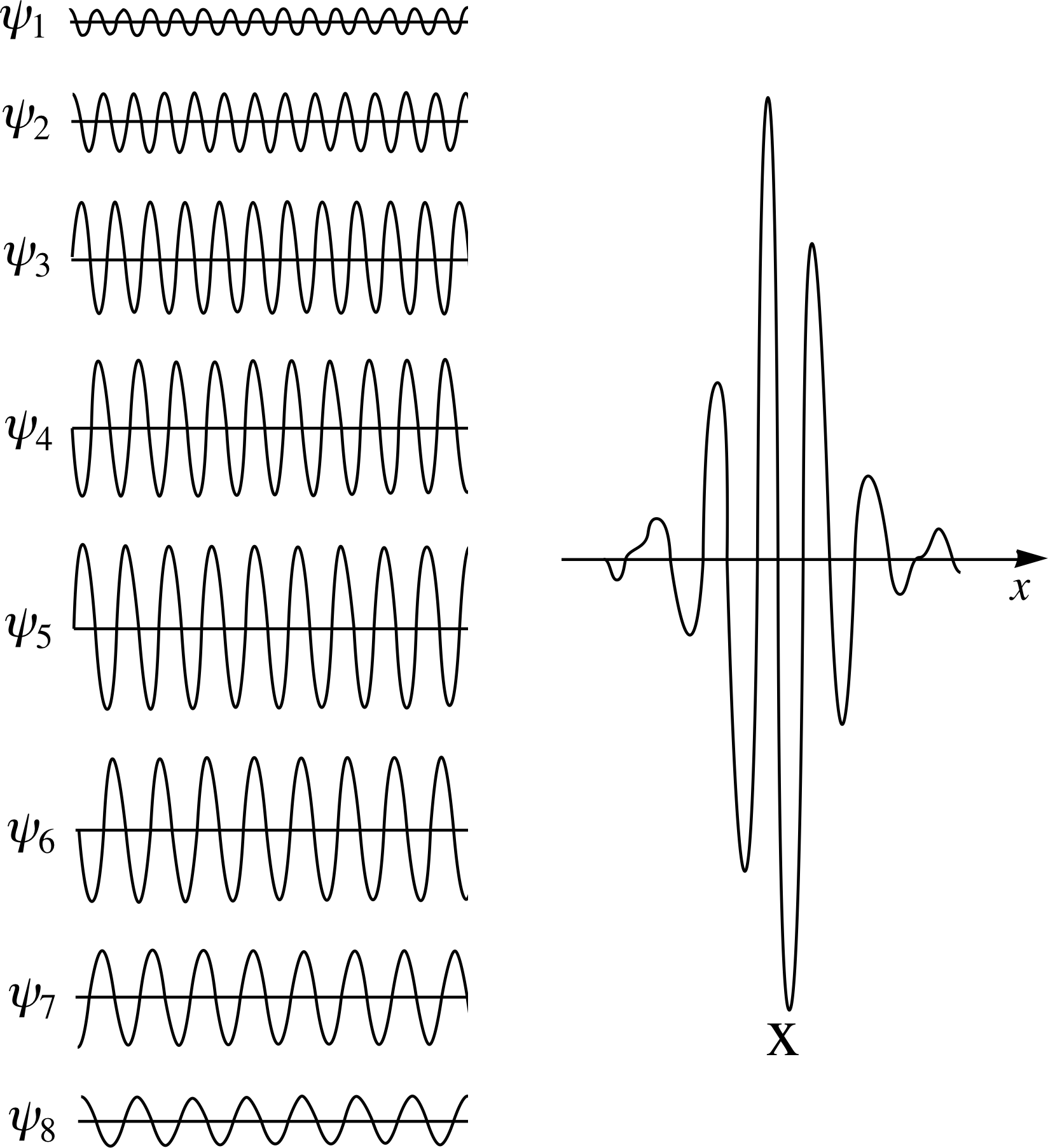 The functions superposed to form the wave packet may be, for instance, sine waves with a continuous range of values of the wave–number k. The mathematics of the superposition – Fourier analysis – determines the contributions of waves with each value of k necessary to produce a given wave packet, as in Figure 4. A general feature is that to produce a smaller value of the range ∆x, a larger range of values ∆k must be included in the superposition, so the two ranges vary inversely, with ∆x ∆k ≈ 1.