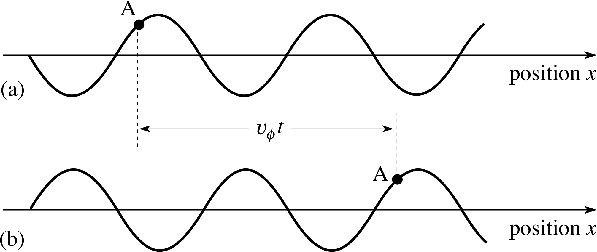 (b) The relationship between the wavelength λ, the frequency f, and the speed υ, of the wave is υ = fλ. In terms of angular wavenumber k and angular frequency ω, the speed is υ = ω/k.