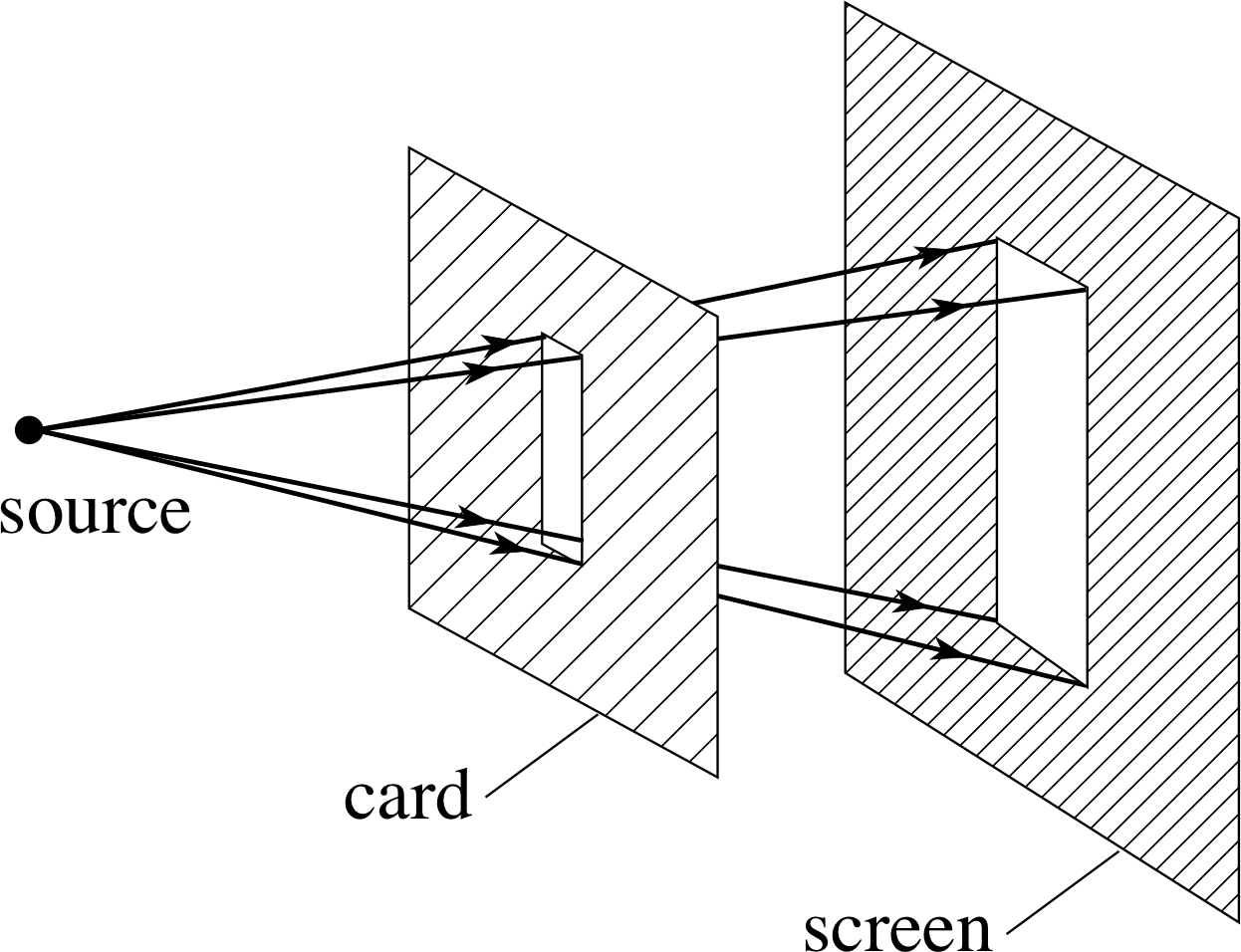‘Light,’ it is often said, ‘travels in straight lines’. Of course, this is an oversimplification; lenses and mirrors can alter the course of a light beam, as can changes or irregularities in the medium (i.e. material) through which the light is moving. Nonetheless, the idea that light travels in straight lines in a uniform medium, sometimes referred to as the principle of rectilinear propagation, does provide a simple characterization of the behaviour of light under a wide range of circumstances. i Evidence in support of the principle is provided by the ‘shafts’ of sunlight that can sometimes be seen streaming through open windows or through gaps in clouds and by countless other natural phenomena. The effect can easily be demonstrated in the laboratory by letting light from a very small source pass through an aperture (cut in an otherwise opaque piece of card) and fall on a screen. This is shown in Figure 1, where the aperture has a rectangular shape. The precise shape of the bright patch on the screen can be predicted by drawing straight lines from the source to the screen. Any line hitting the opaque part of the card is stopped, otherwise it passes through to the screen.