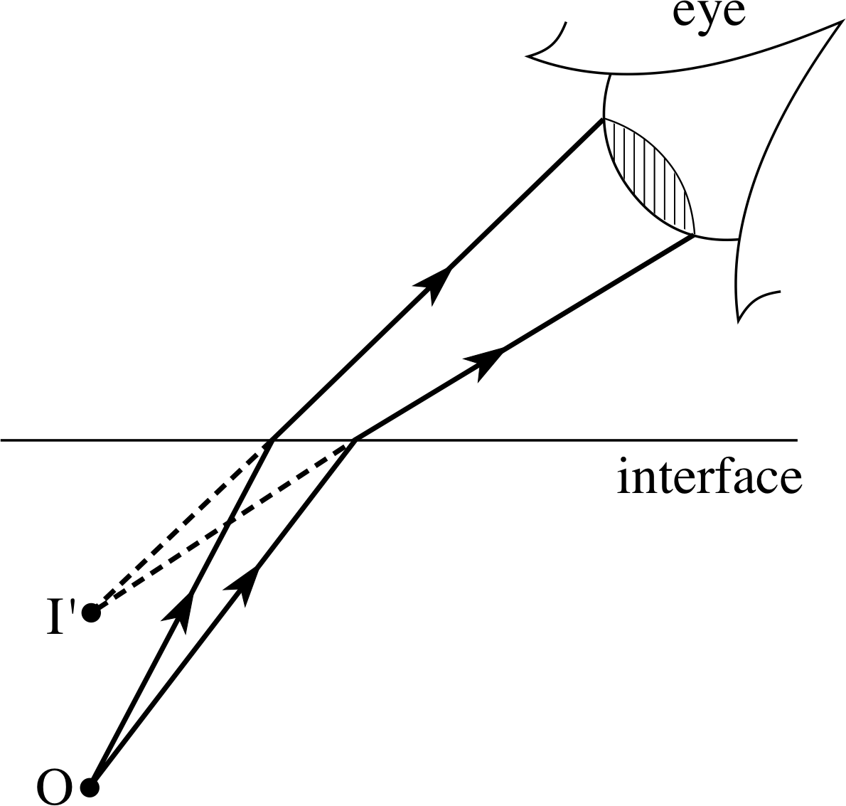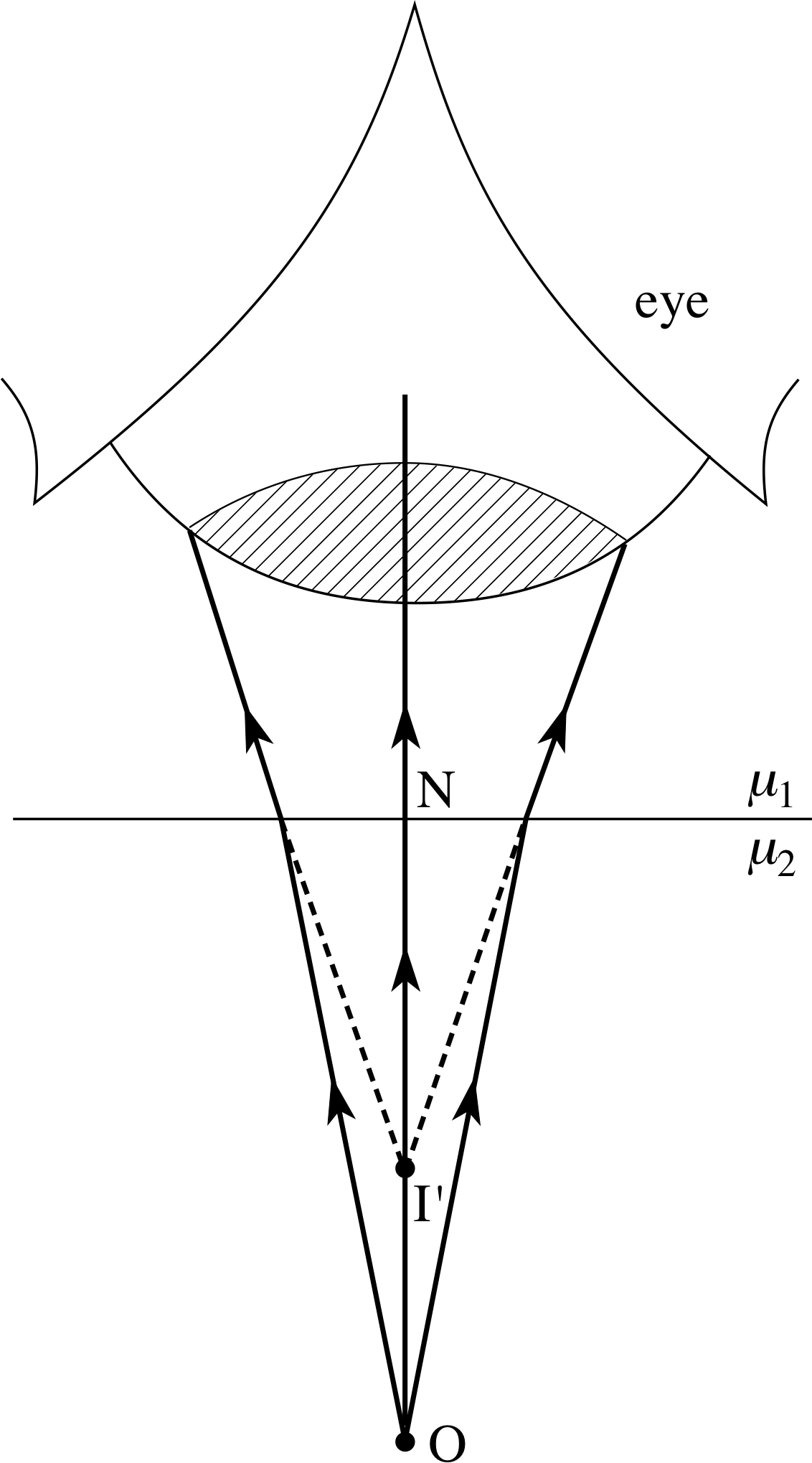 We now refer back to Figure 4, which shows the formation of a real image by reflection at a plane mirror followed by refraction in a human eye. In this case there are many different rays from a point on the object to the corresponding point on the (real) image. Since all of these rays are equally valid no one of them can be singled out as corresponding to the minimum (or maximum) time; indeed, we can conclude from Fermat’s principle that light takes the same amount of time to traverse each of these rays. This situation must generally occur when a real image is formed and provides another way of thinking about images and about Fermat’s principle: all rays from a point on an object to the corresponding point on its image must take the same time to traverse.