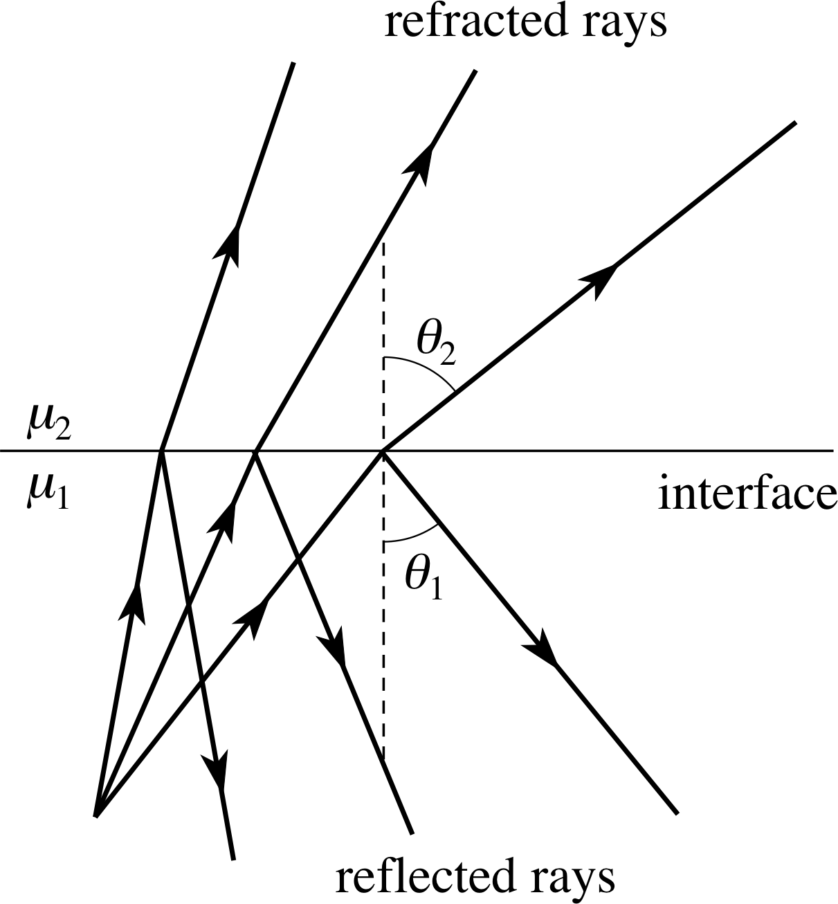 Figure 7 Reflection and refraction of a ray of light at the interface between two different transparent materials, where μ2 > μ1.