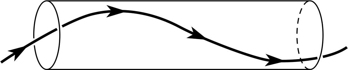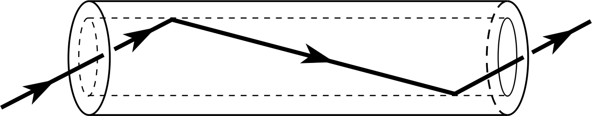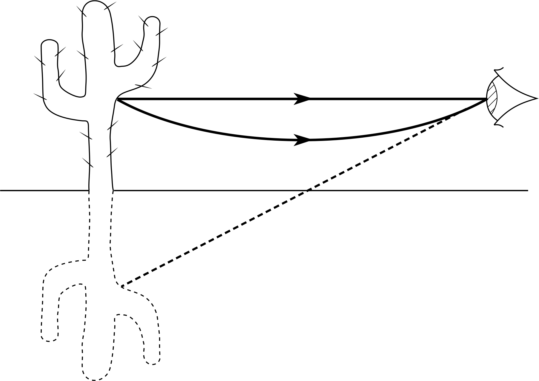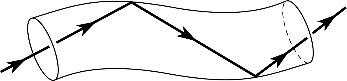 Refer to the discussion and the figures given in Subsection 4.4. The direction of a continuously refracted ray changes smoothly rather than abruptly, thus the ray is a curve rather than a straight line. For a ray to be continuously refracted there must be some variation of the refractive index from place to place, i.e. the medium must be of non–uniform optical density. A ray of light entering the Earth’s atmosphere with a non–zero angle of incidence provides a good example of the kind of ray that will be continuously refracted. Continuous refraction is responsible for the production of optical mirages and for the operation of graded–index optical fibres.