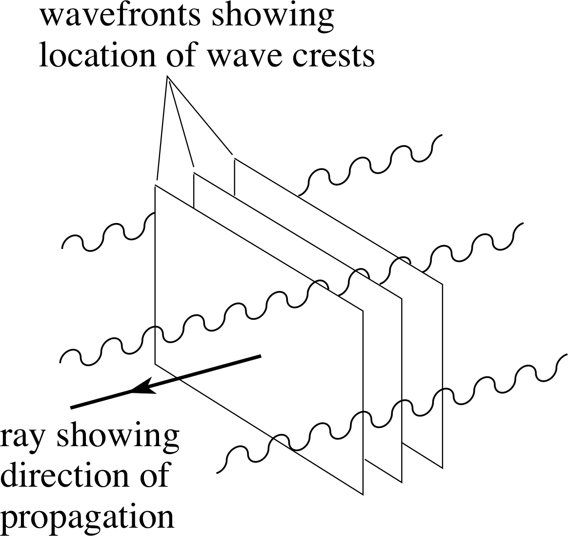 Figure 2 In terms of the wave model of light, rays are drawn perpendicular to wavefronts at any point and indicate the direction in which those wavefronts are moving.