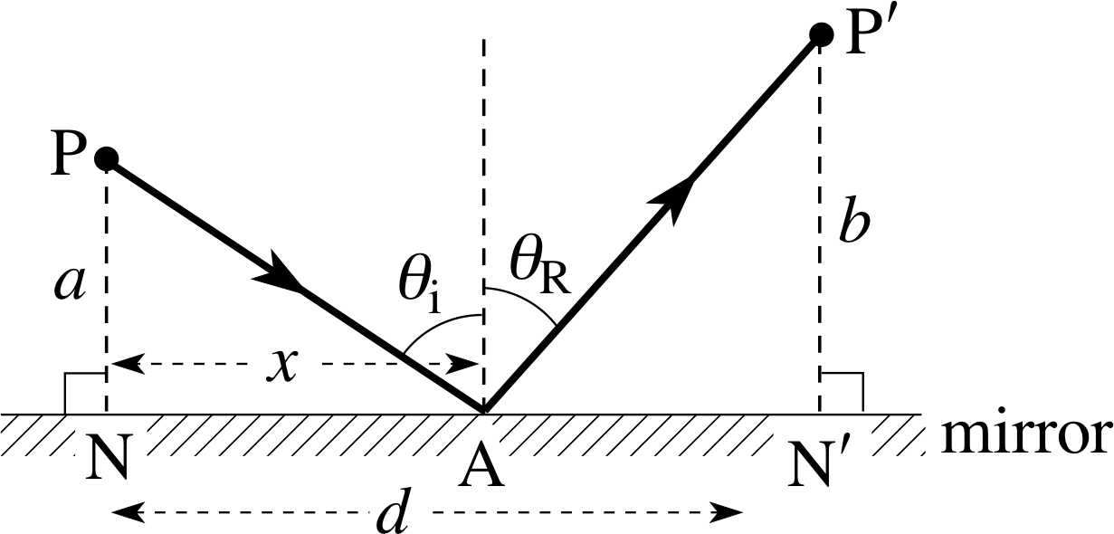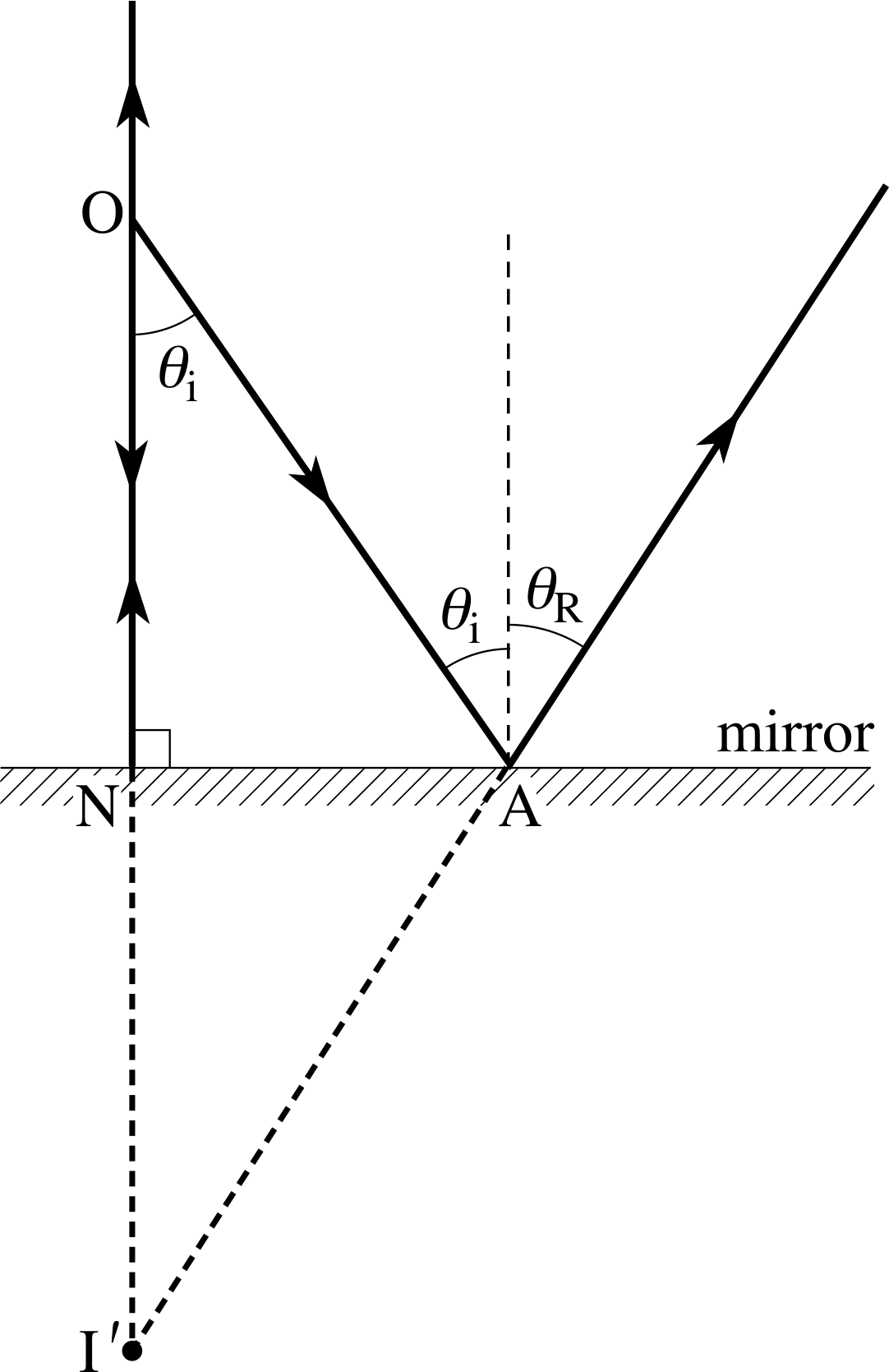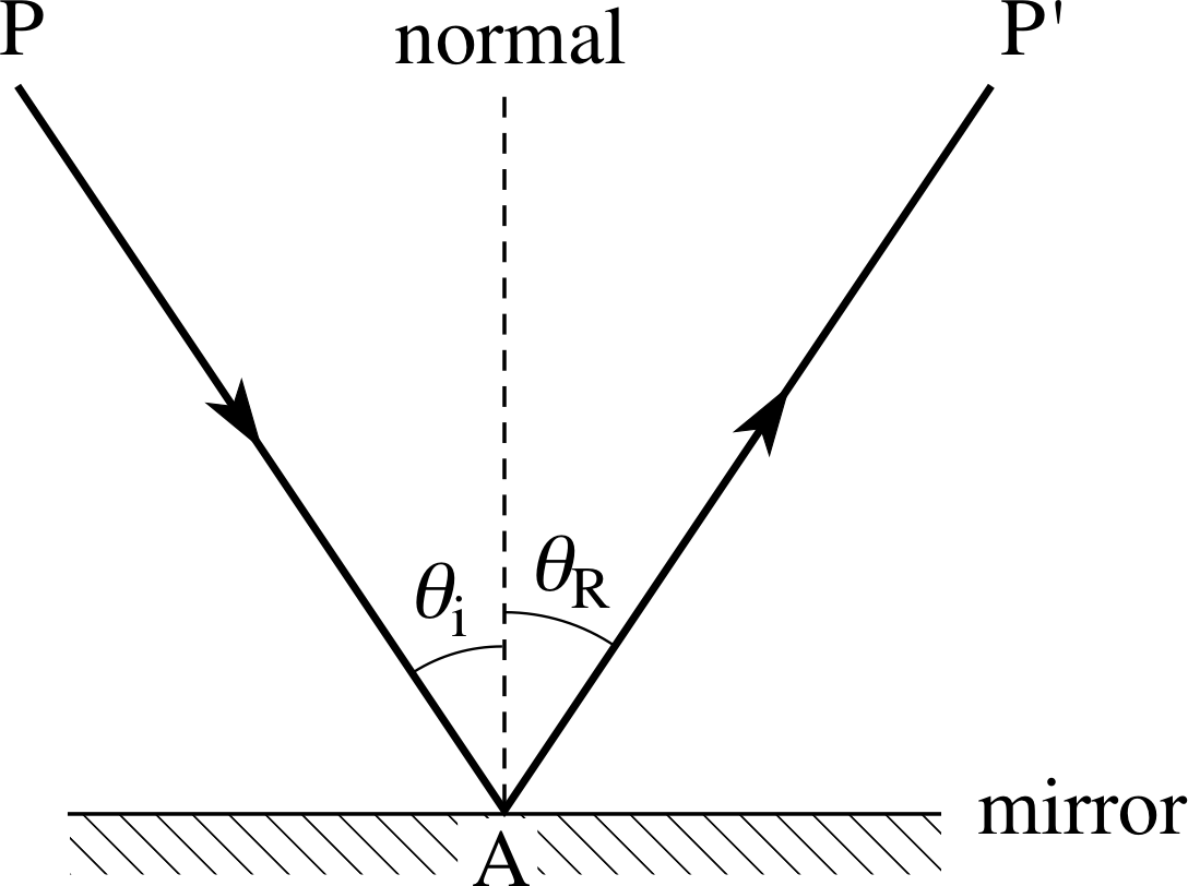 Figure 3 shows a light ray from any point P striking a mirror at point A, which is called the point of incidence, and, after reflection, passing through a point P′. The line drawn perpendicular to the mirror at A is called the normal and the angles made by the incoming incident ray and the outgoing reflected ray to the normal at the point of incidence are known as the angle of incidence θi and the angle of reflection θR, respectively. i Experiments clearly demonstrate the following law of reflection, which has been known since ancient times.