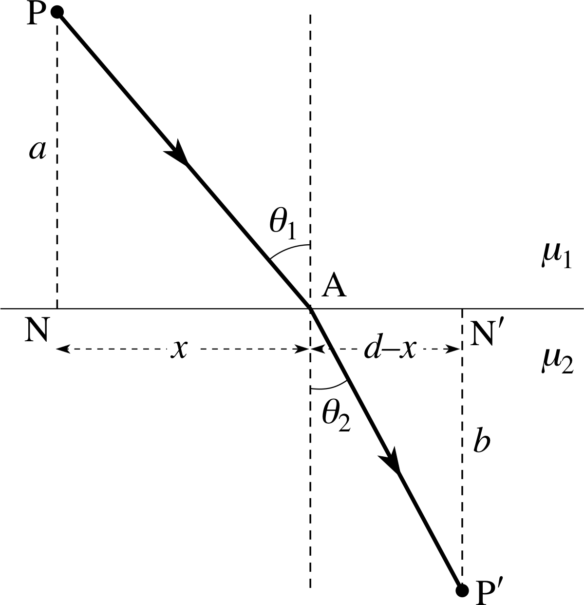 Thus, as claimed earlier, the law of refraction is a consequence of Fermat’s principle. i This is precisely what we expect – Fermat’s principle has given us Snell’s law of refraction. Any closely similar path from P to P′ would take a longer time than the actual path.