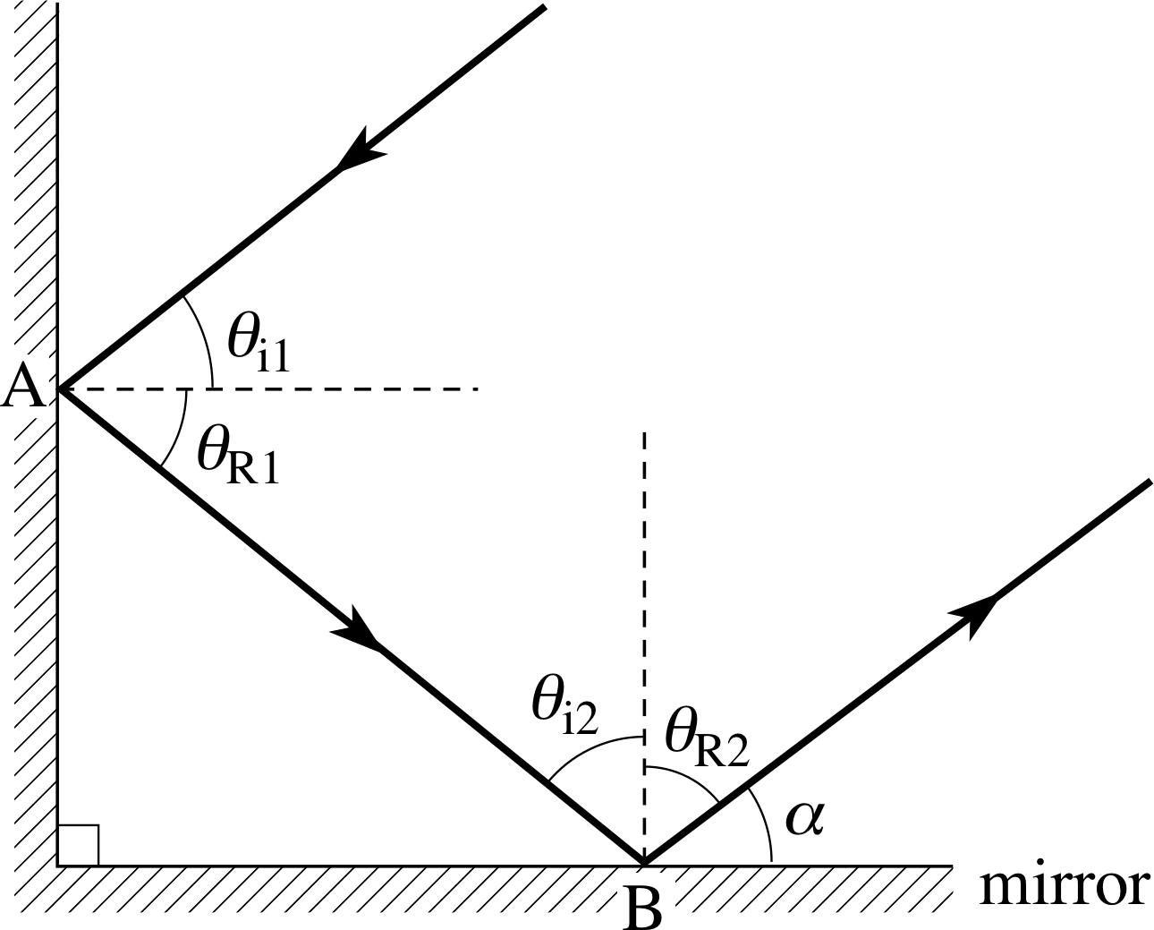 See Figure 23. At the first reflection, point A, the reflected angle θR1 is equal to the incident angle θi1. The mirrors are at right angles so that at the second reflection, point B, θi2 = 90° − θR1 and θR2 = θi2 = 90° − θR1. The angle of the ray relative to the horizontal after the second reflection is given by: