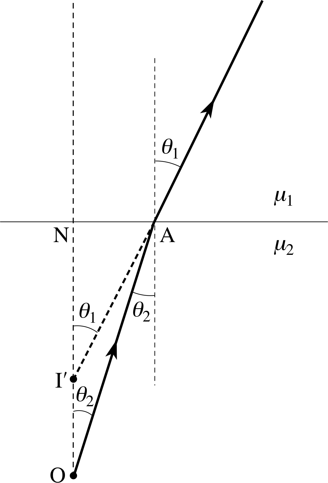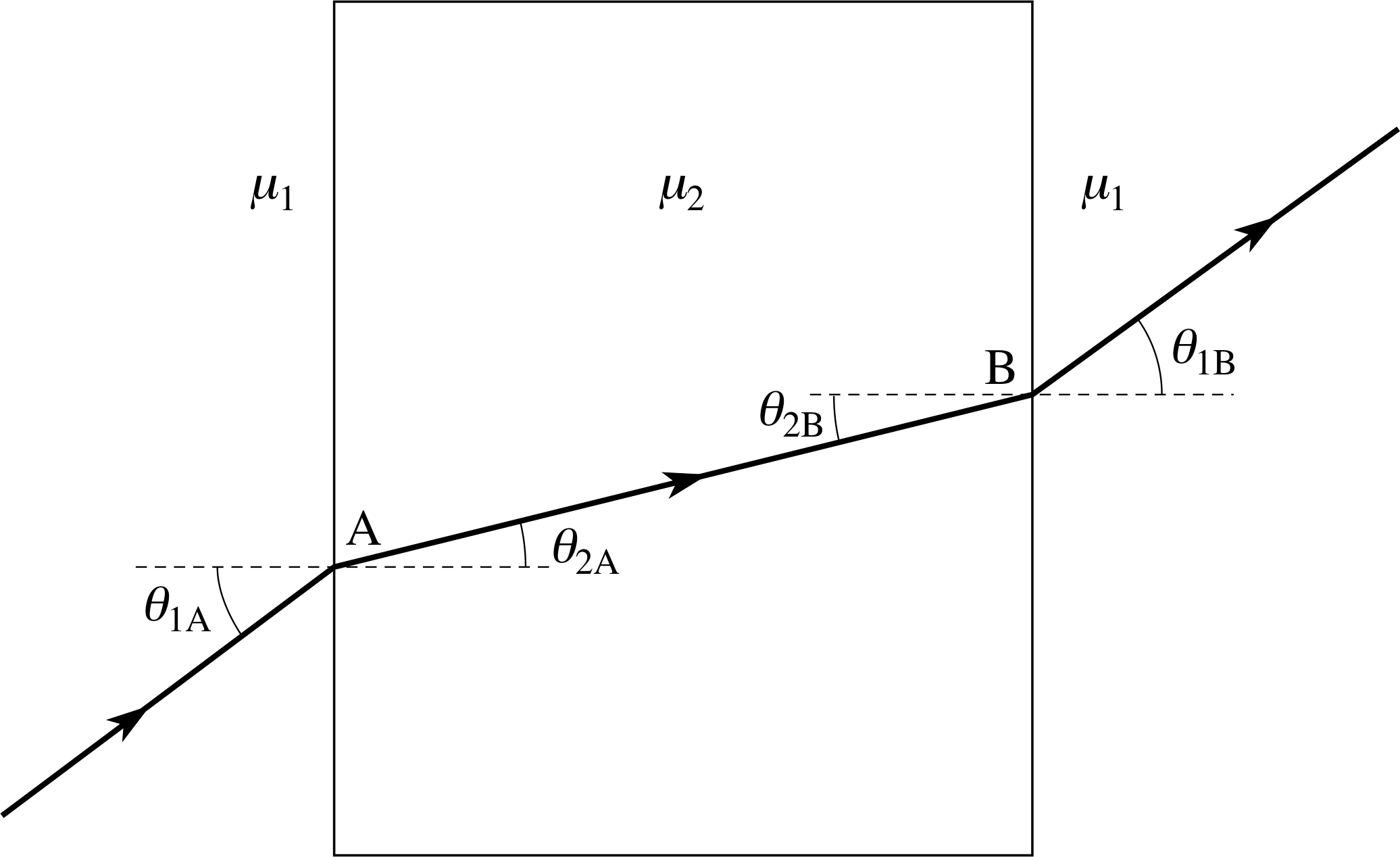 This is of course just Snell’s law for the interface between material 1 and material (m + 1) and the ray does emerge as if it had passed directly from the 1st to the (m + 1)th material.