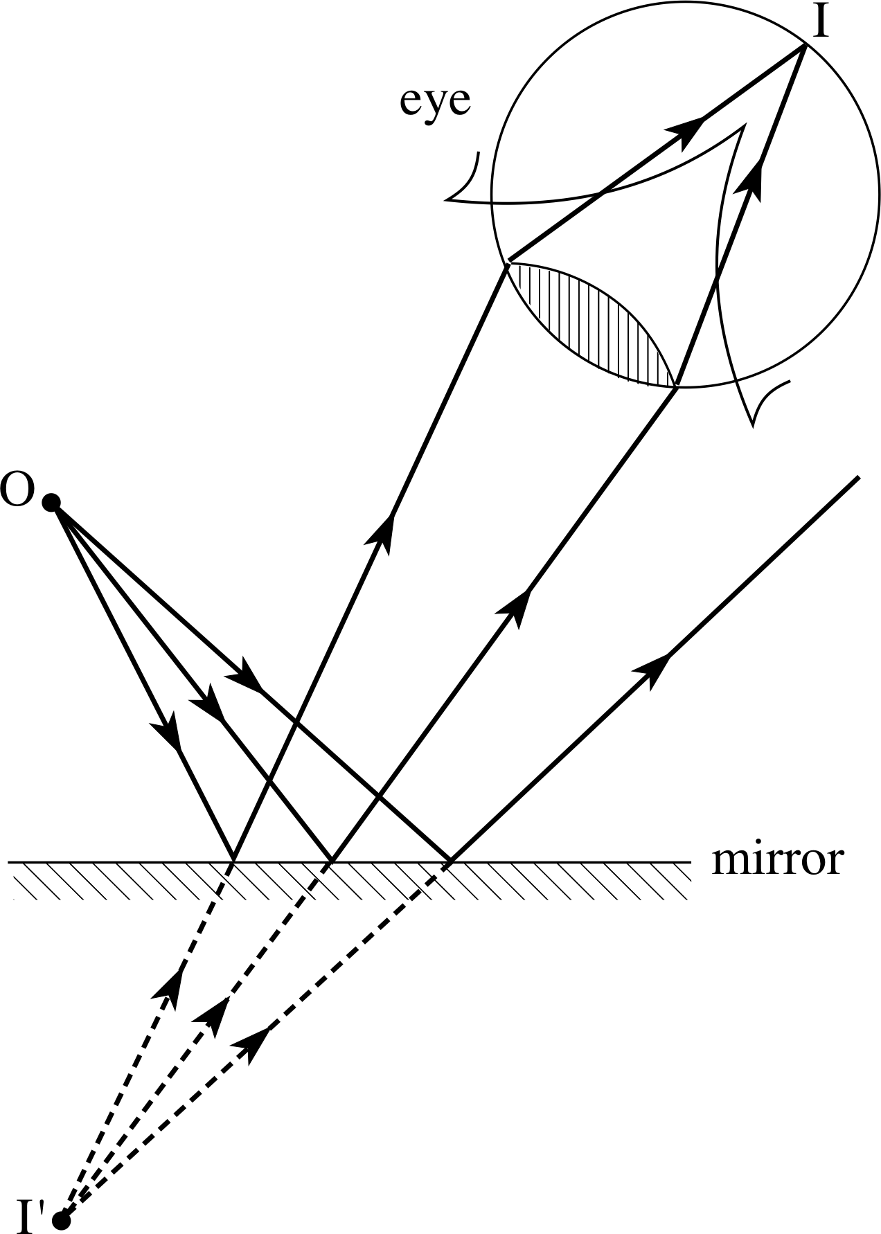 Figure 4 A bundle of rays diverging from O and reflected by a plane mirror, forms a virtual image at I′ behind the mirror, while the human eye forms a real image at I.
