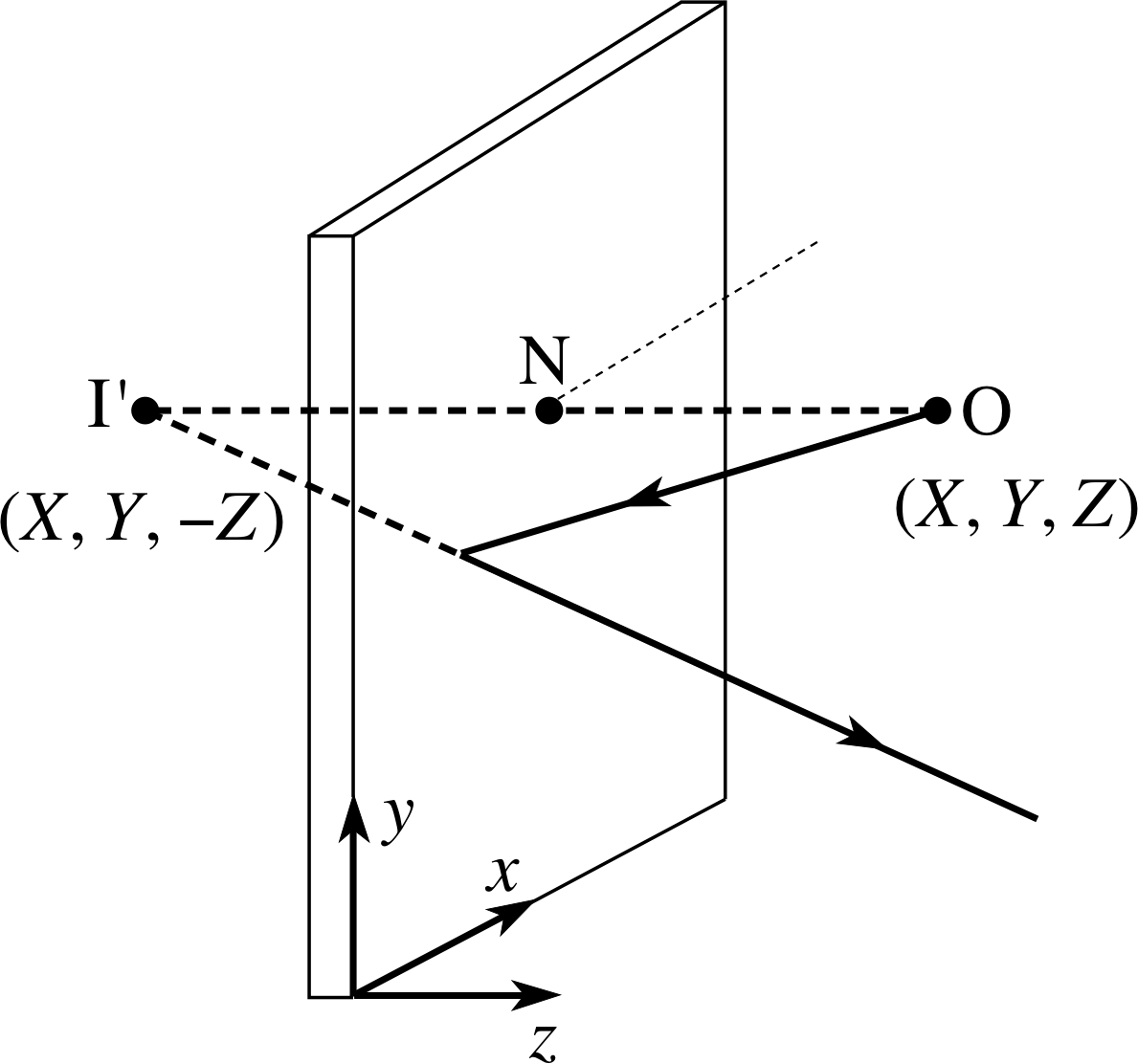 We can formalize the result of Question T2 by associating a Cartesian coordinate system with the mirror, as shown in Figure 5, with the x- and y–axes in the plane of the mirror and the z–axis normal to the mirror. If the coordinates of the object at point O are (X, Y, Z) then the coordinates of the point N (where the normal from O meets the mirror) will be (X, Y,, 0), and since the length NI′ is Z, the coordinates of the virtual image point I′ are (X, Y, −Z). Thus, when a plane mirror is used to form a virtual image of a point object, the coordinates of the image may be found from the coordinates of the object by changing the sign of the coordinate measured normal to the mirror while leaving the coordinates measured parallel to the mirror unchanged.