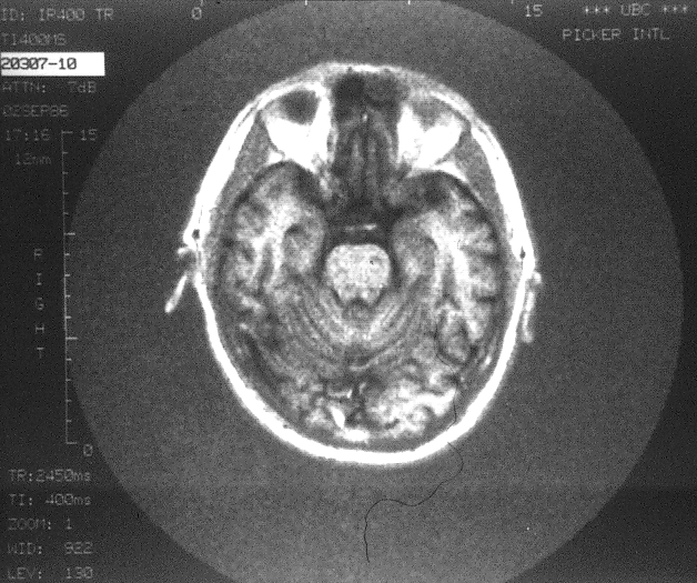 ... and another one. Notice the anatomical detail in these images of the soft tissues of the brain. Even on these images, acquired in 1986, complex folds and other topological features are obvious; the state-of-the-art in NMR Imaging has advanced a great deal since then! |