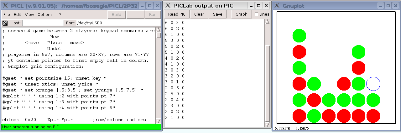 Connect-4 game running on PIC with real-time output to Gnuplot: