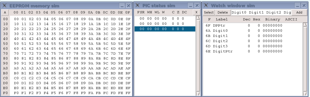 on windows that monitor the state of file registers, EEPROM and program memory, user