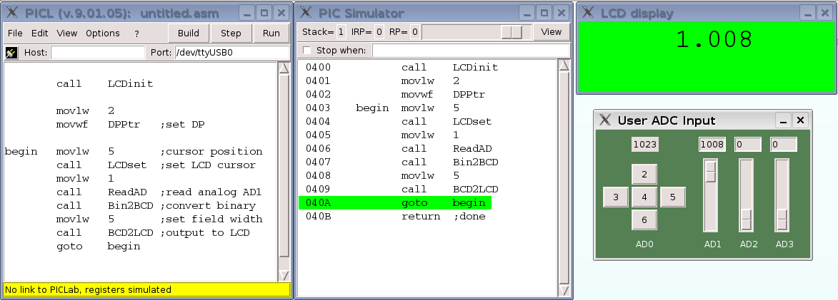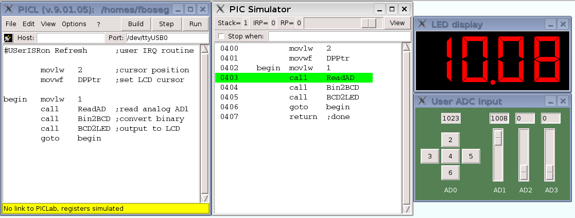 in a PIC instruction, press a GO button and immediately observe changes to the PIC board